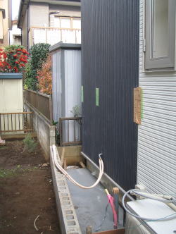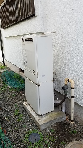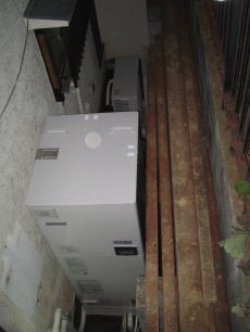 既設のガス給湯器からの交換工事です。ガス業者さんに先行でガスメーターなどを撤去して頂いてから、基礎打ちをしての設置となりました。