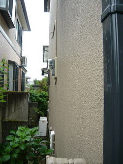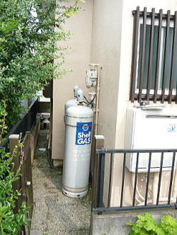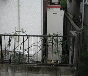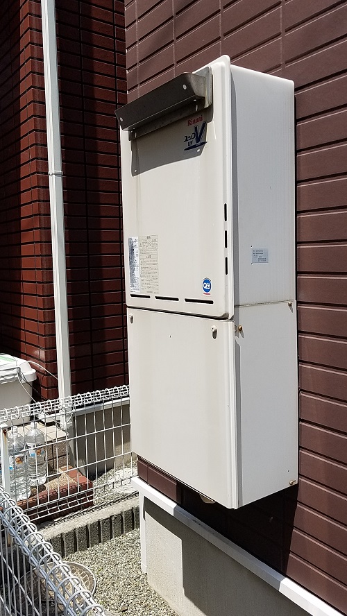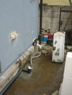 既設のガス給湯器からの交換工事です。建物と壁の間が狭かった為、薄型タイプを選択致しました。