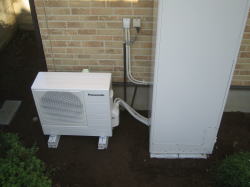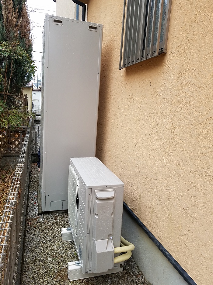 既設の配管位置を確認しながら、なるべく同じような位置にエコキュートのタンクを設置し、その隣にヒートポンプを設置しました。