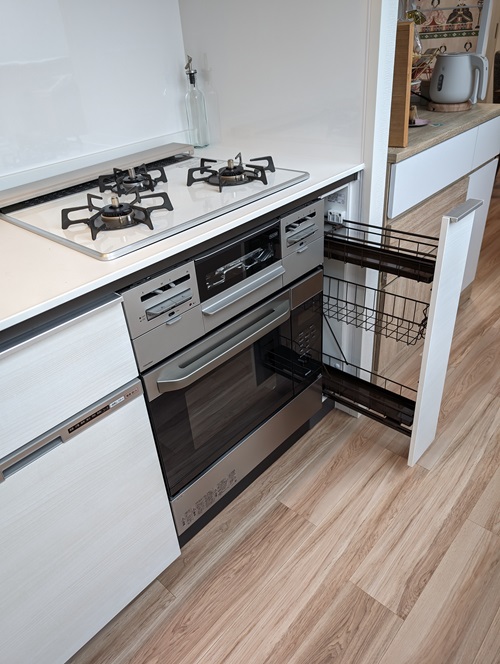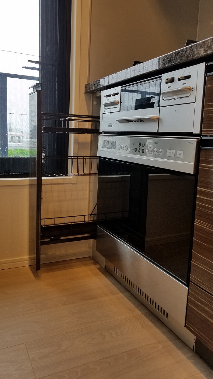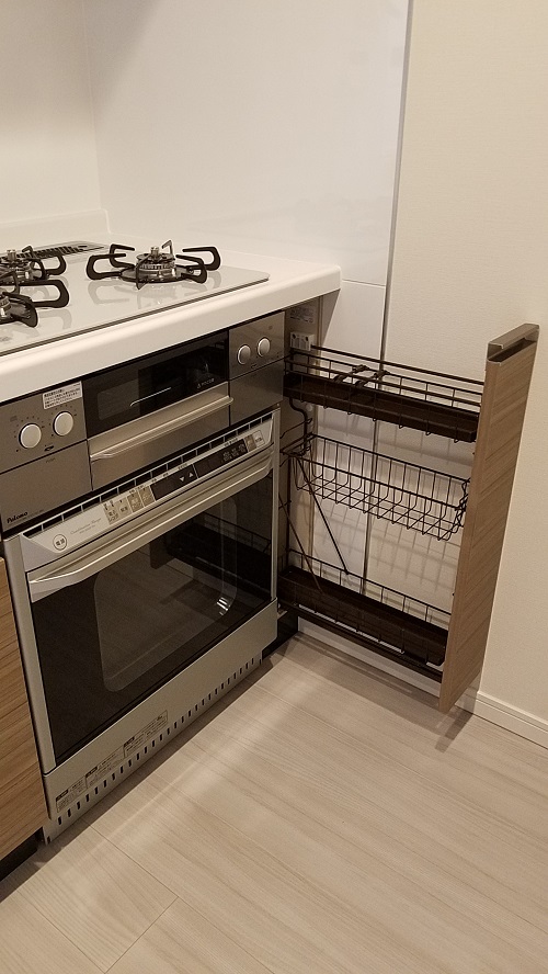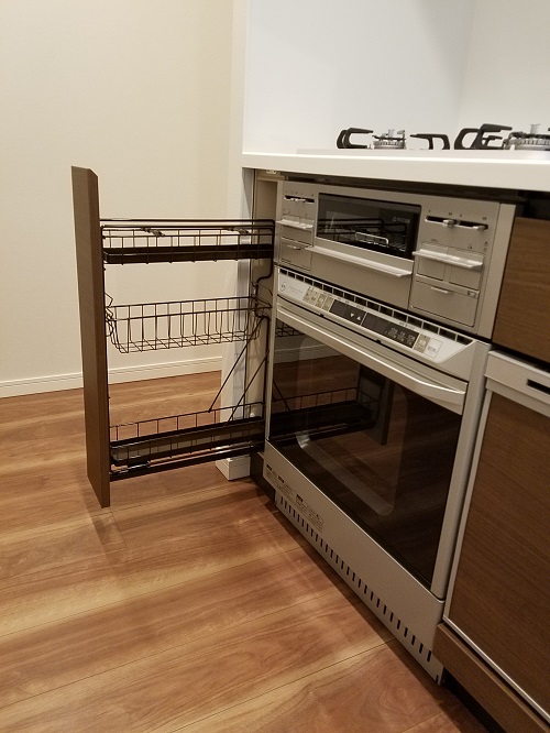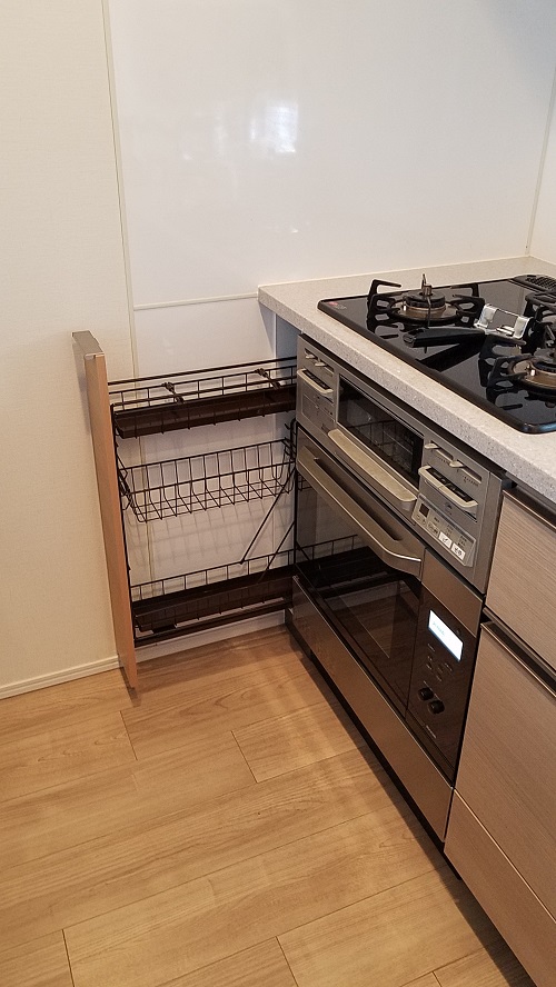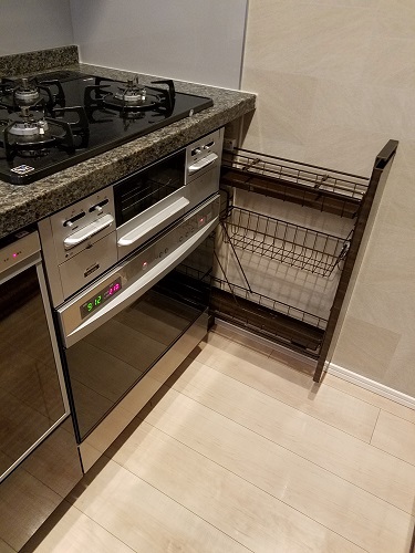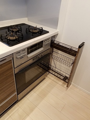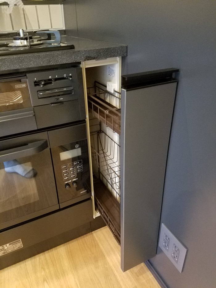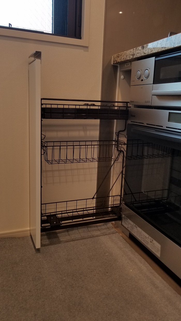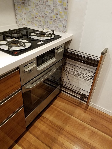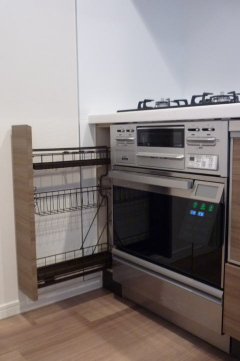通常、75cm部分にはオーブンは設置できませんが、こうして15cm幅のスパイスラックを設置することで、設置が可能になります。
