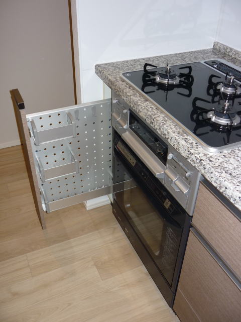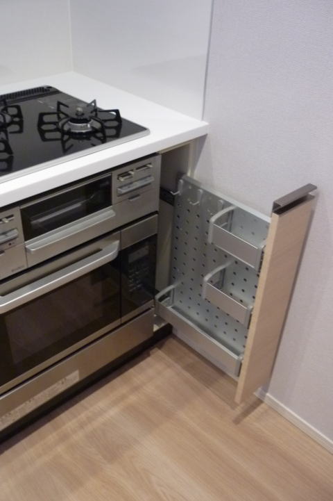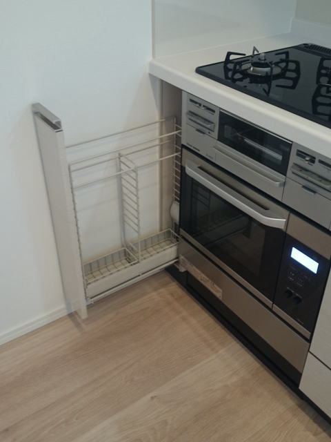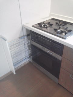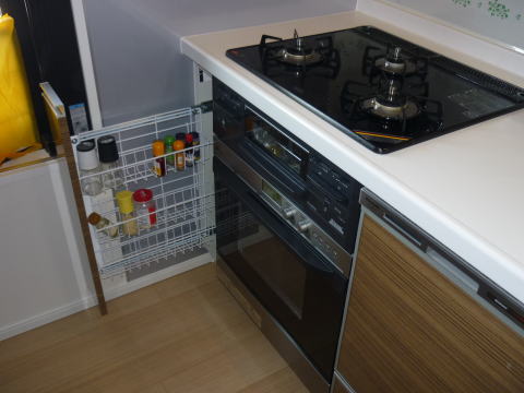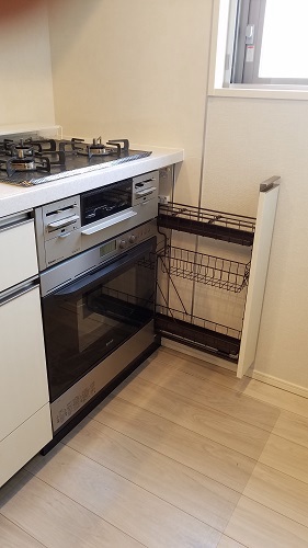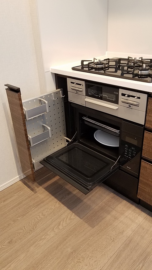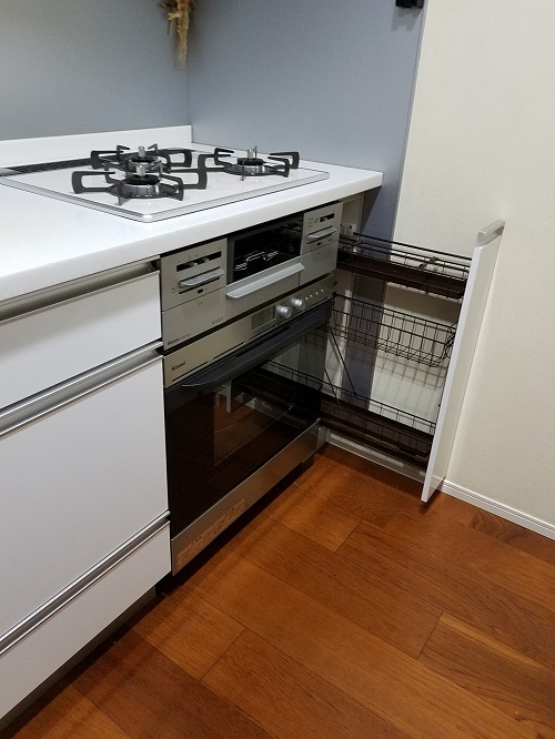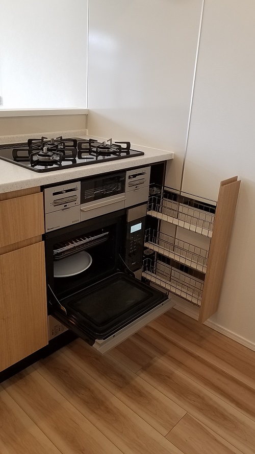 そこで、お客様にが建築様など通じて幅15cmのスパイスラックをご手配頂いてオーブンを設置致しました。