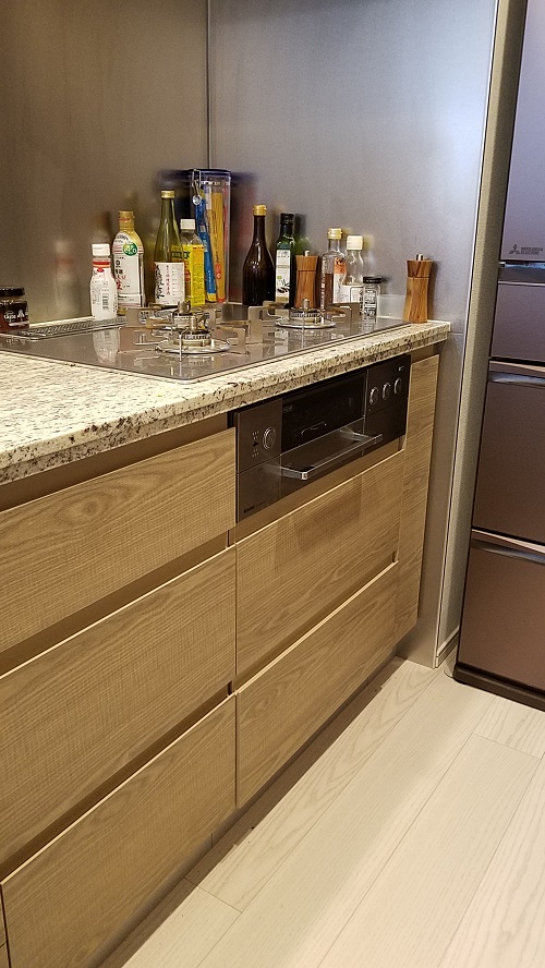 新しく設置したキャビネットのデザインが既設のキッチンと異なるのは致し方ありませんが、キャビネットを設置したことでオーブン設置で無くなった収納を食洗機部分に確保できました。