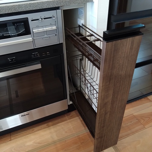 既設のキッチンと同じ扉のスパイスラックはご手配できませんので若干の違和感はございますが、どうしても収納を潰したくないと言うお客様にお勧めの方法です。