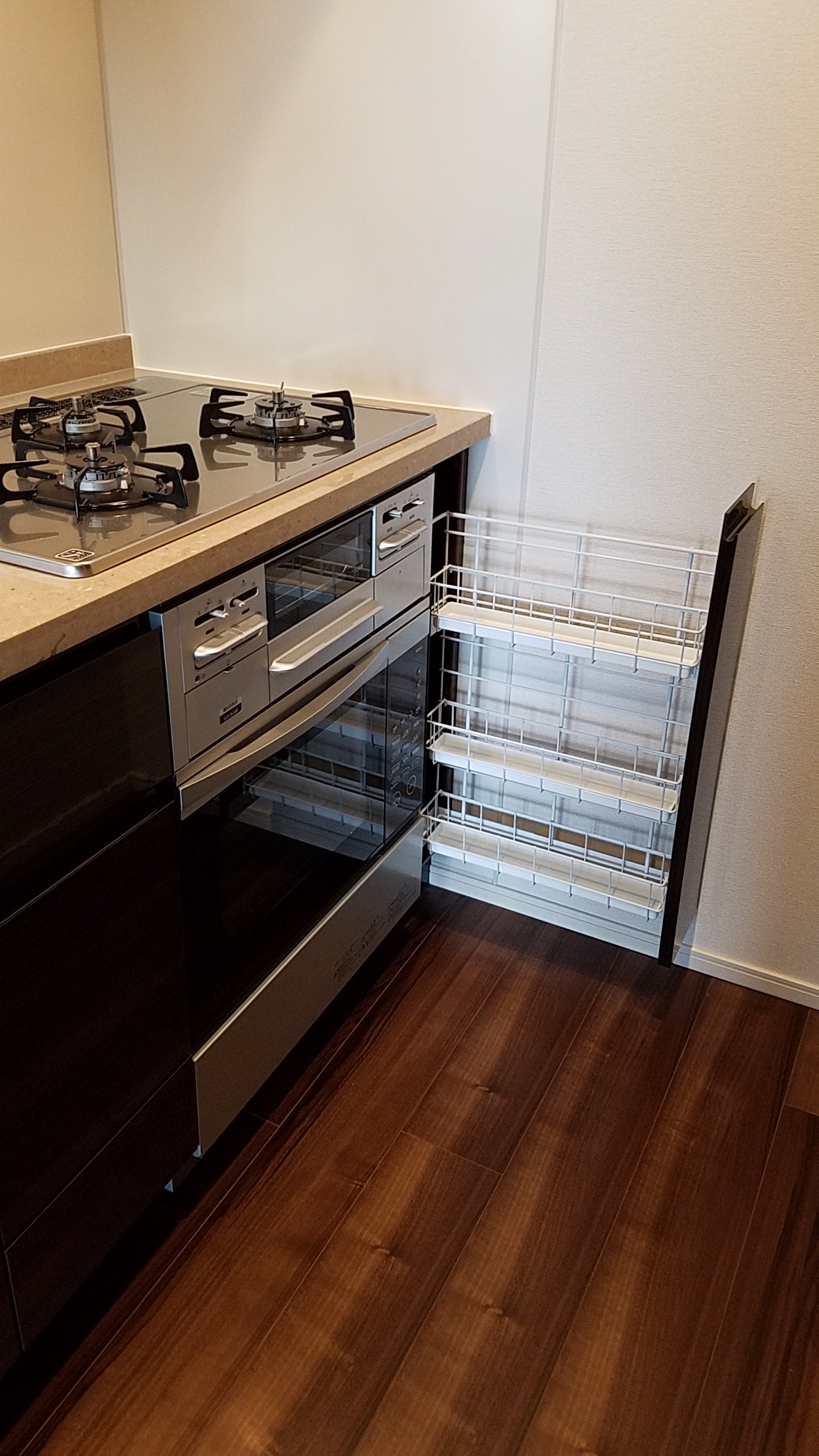 こちらの取付スペースは、W750でしたのでオーブン(W600)の右側にW150のスパイスラックを取り付けました。