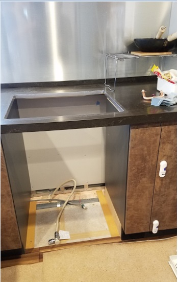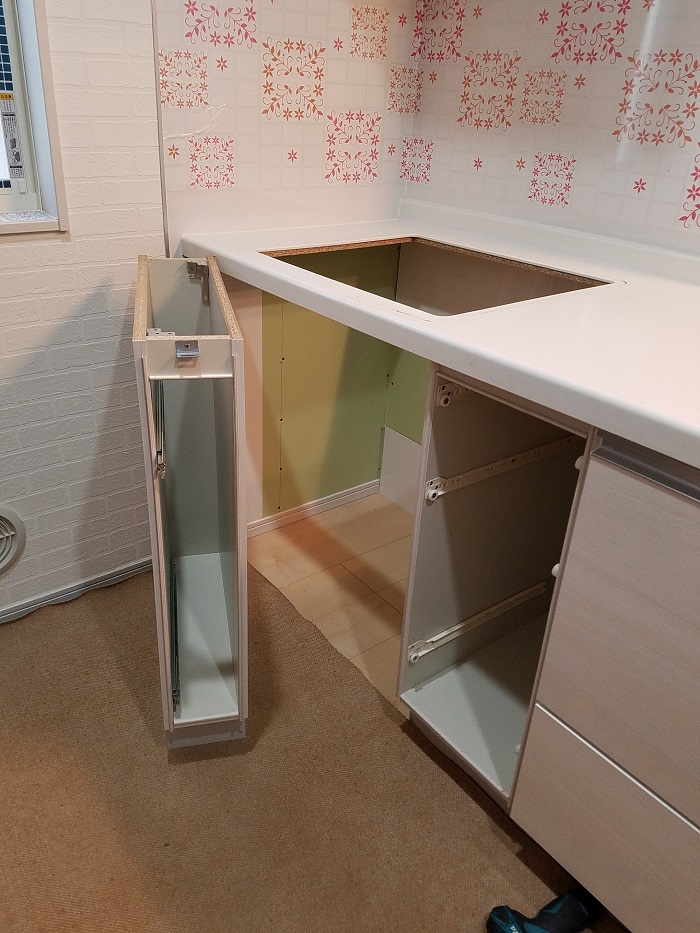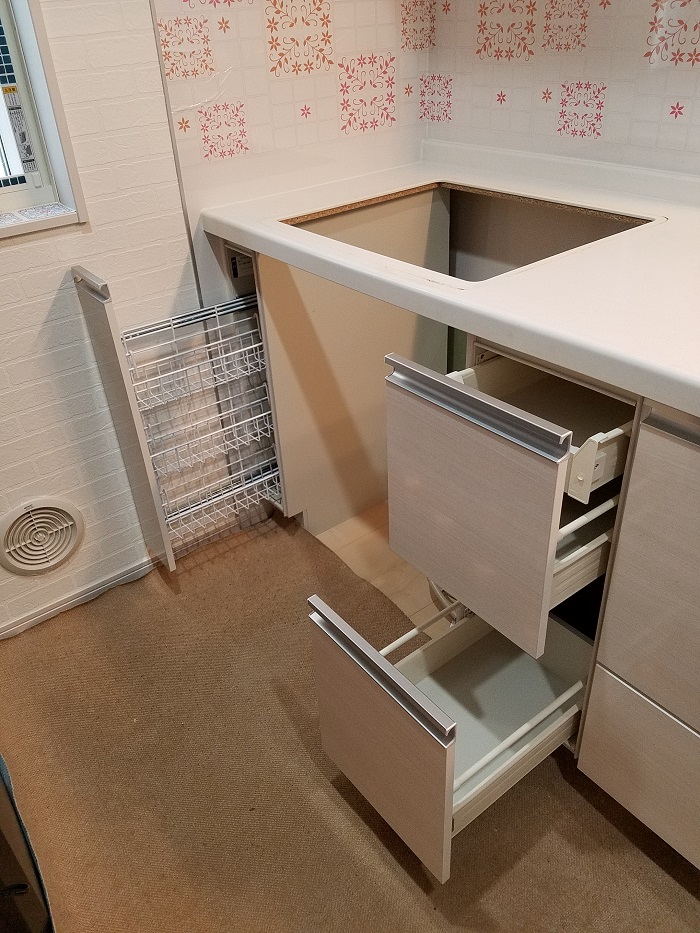 W300の食洗機がありましたが故障してしまい、取替可能な後継品も無い事から収納キャビネットをご手配して設置致しました。