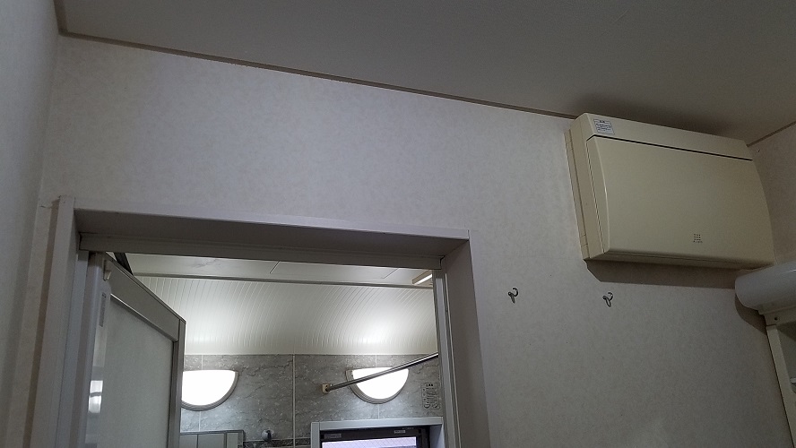 今回、分電盤が浴室隣の洗面所の壁面にあり、分電盤の裏側が浴室でしたので、専用回路の配線工事も容易にできました。