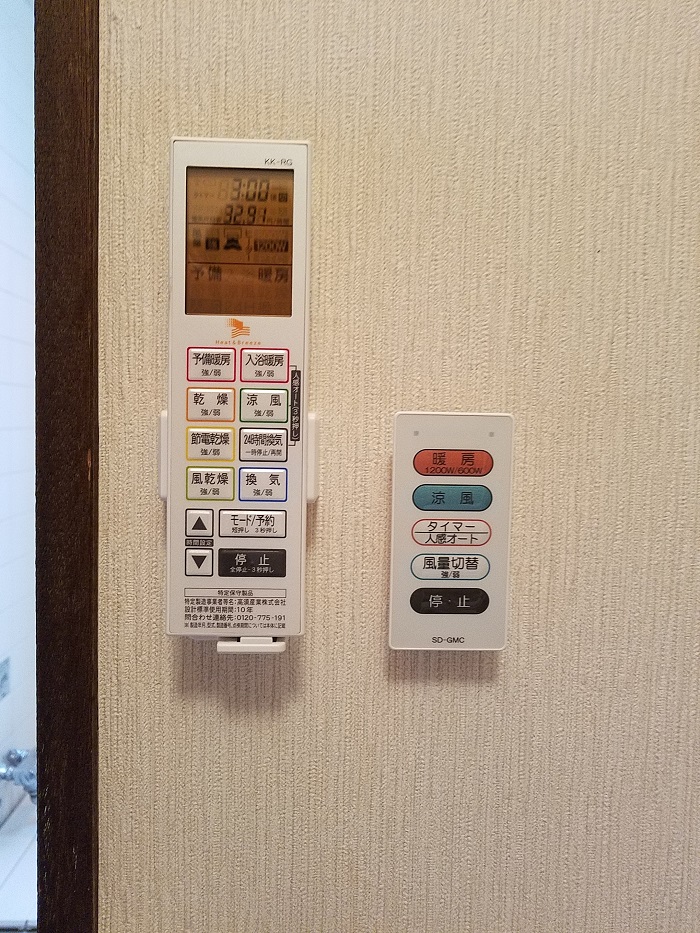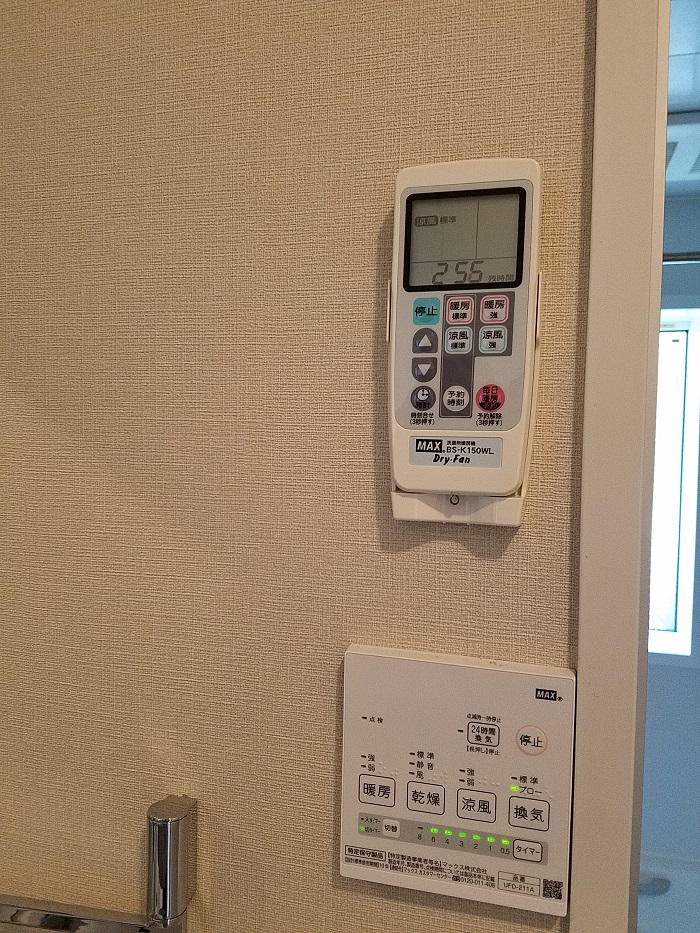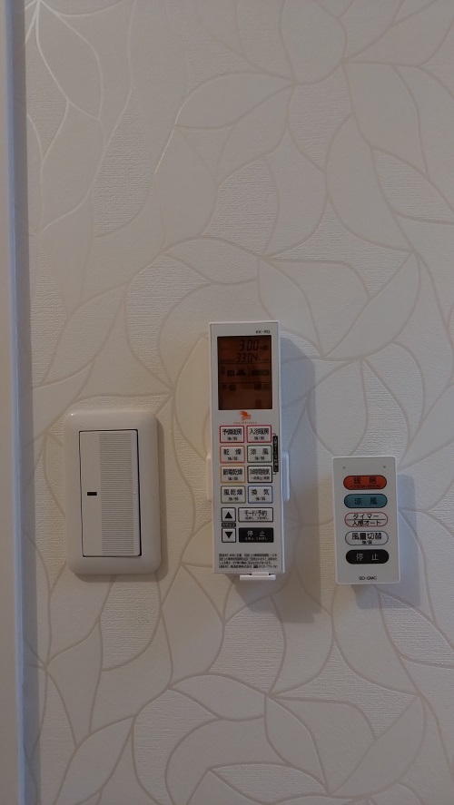 また、浴室乾燥機はリモコン操作となりますので換気扇のスイッチが不要になったため、追加工事でスイッチプレートを3口から2口に交換致しました。
