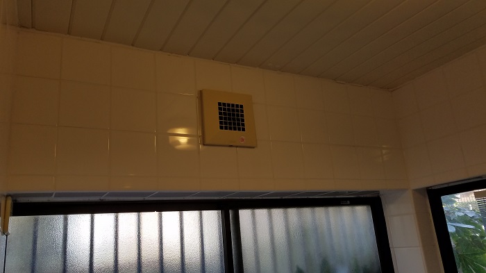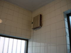 既設の換気扇の開口を利用した、壁掛け型の浴室乾燥機の新設工事の例です。