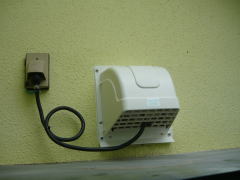 通気口には電源がありませんので、外壁面にある直近の防雨コンセントから配線を分岐致しました。