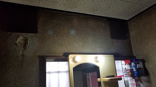 浴室天井裏が2階の床下収納から確認できましたので、洗面所から天井裏を通して外壁側へ配線をしています。